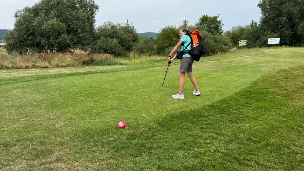 Next came the first and only hill of the day. It was blissfully short and ended at one end of a golf course through which our path ran straight through. Allison decided to get in a few practice swings during lunch.