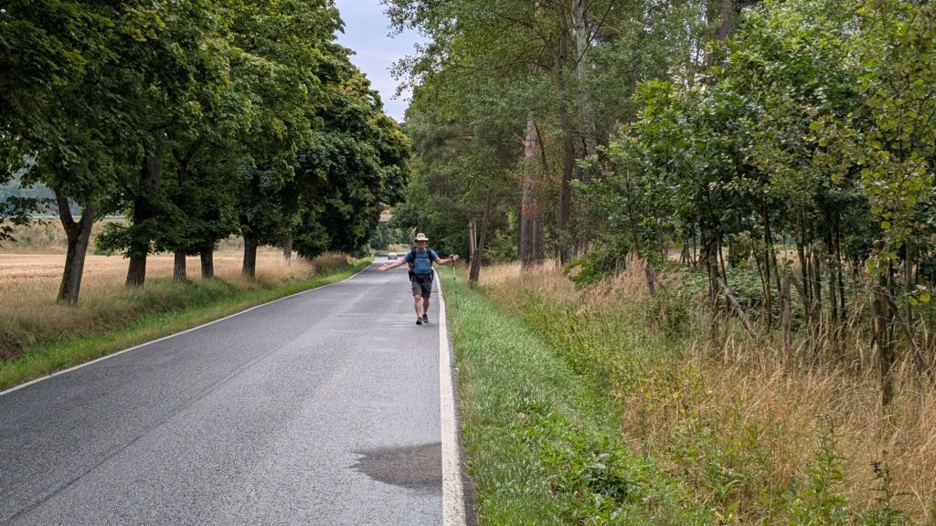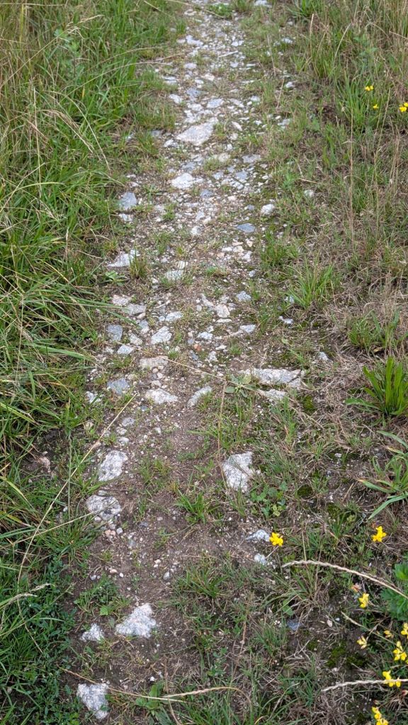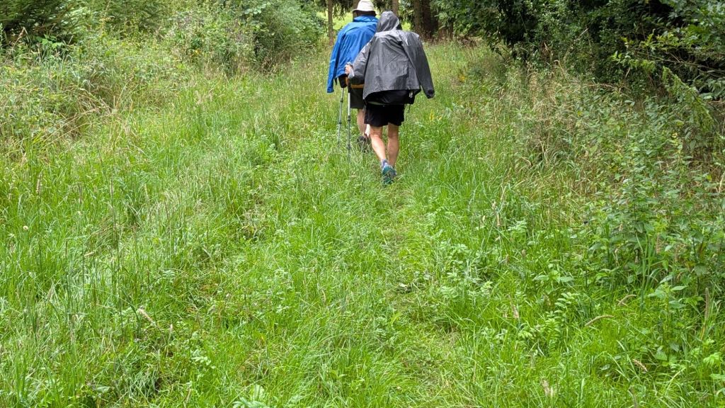 The path today varied a lot. We walked on paved roads, gravel roads, farm roads, through fields and through the woods. And yes , our feet did get wet since it rained last night and today as well. It always amazes me how varied our path is in just one day.