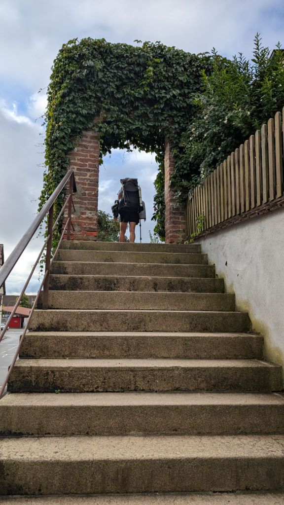 Our pilgrim credentials are beginning to fill up. We were able to accumulate at least two more stamps today. Both were from evangelical Lutheran churches. One church had a beautiful exterior arch and pretty stained glass windows.