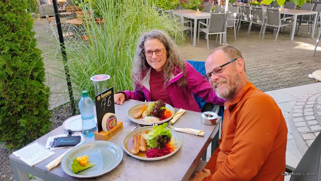 I just want to add that we started out day with a breakfast of bread slathered in butter, honey and jam, yogurt with muesli, and fruit. A few hours later a bakery stop with savory bread and pretzel (as that was the town’s speciality) and tonight we are having Ramen noodles with chocolate for dessert.