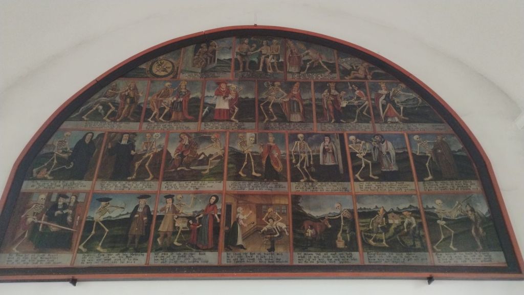 From the church brochure: “The Dance of Death in the Holy Cross Chapel shows, from above and from left to right, the various classes in confrontation with the skeleton, which represents death