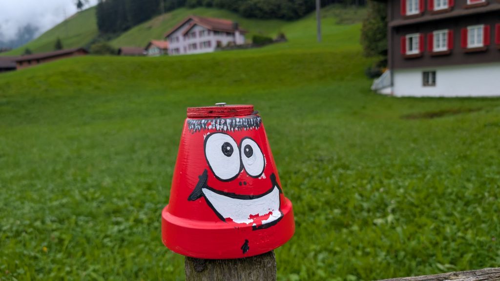 Later we stopped to have coffee and tea in the little village of  Emmetten before we descended steeply down the mountain. The fences in this town had painted flower pots on top of their wooden fence posts. It was very fun and made us all smile and take lots of pictures. The practical purpose of the pots is to slow down the decaying process of the wood. But creative flower pots are always eye catching.