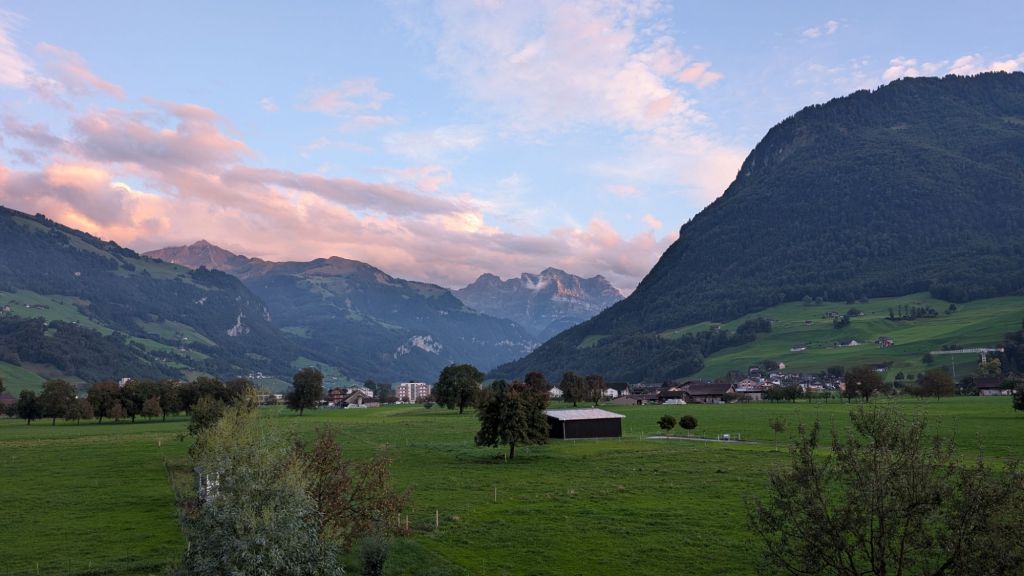 Our lodging tonight is on a farm just past the city and many car dealerships. But the views of the Alps from our room are stunning.  We have a kitchen to cook, and Mark graciously walked at least a mile to the grocery store to purchase food for us. Dinner was delicious. Our friend Johannes joined us for dinner. Conversations and friendships are a treasured part of our journey.