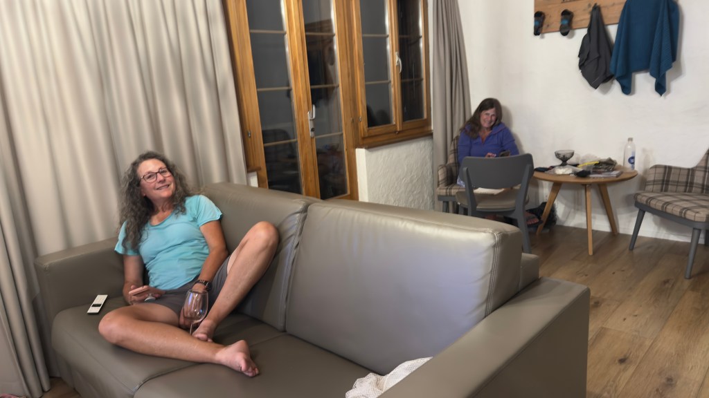 The sun is setting earlier and earlier here. Even the sunset here is something to behold. The temperature is already dropping quickly as the sun is behind one of the Alps. Dinner is cooking and we are all in relaxation mode.