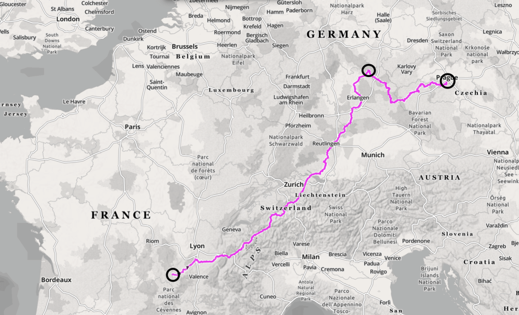 The route starts in Prague, the capital of the Czech Republic and heads roughly westward across the Bohemian regions and over the Sudetes mountains into German Bavaria.